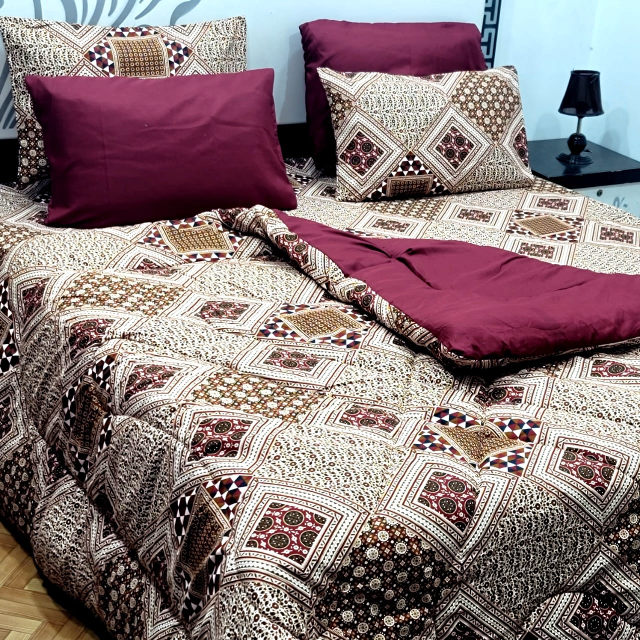 This TYTAN Cotton Razai Set is perfect for adding a touch of luxury to your bedroom. Made from high-quality cotton, it features a 6-piece set that includes a quilt, shams, and decorative pillows. With its soft and comfortable material, you'll drift off into a peaceful sleep every night. Upgrade your bedding with cozify.